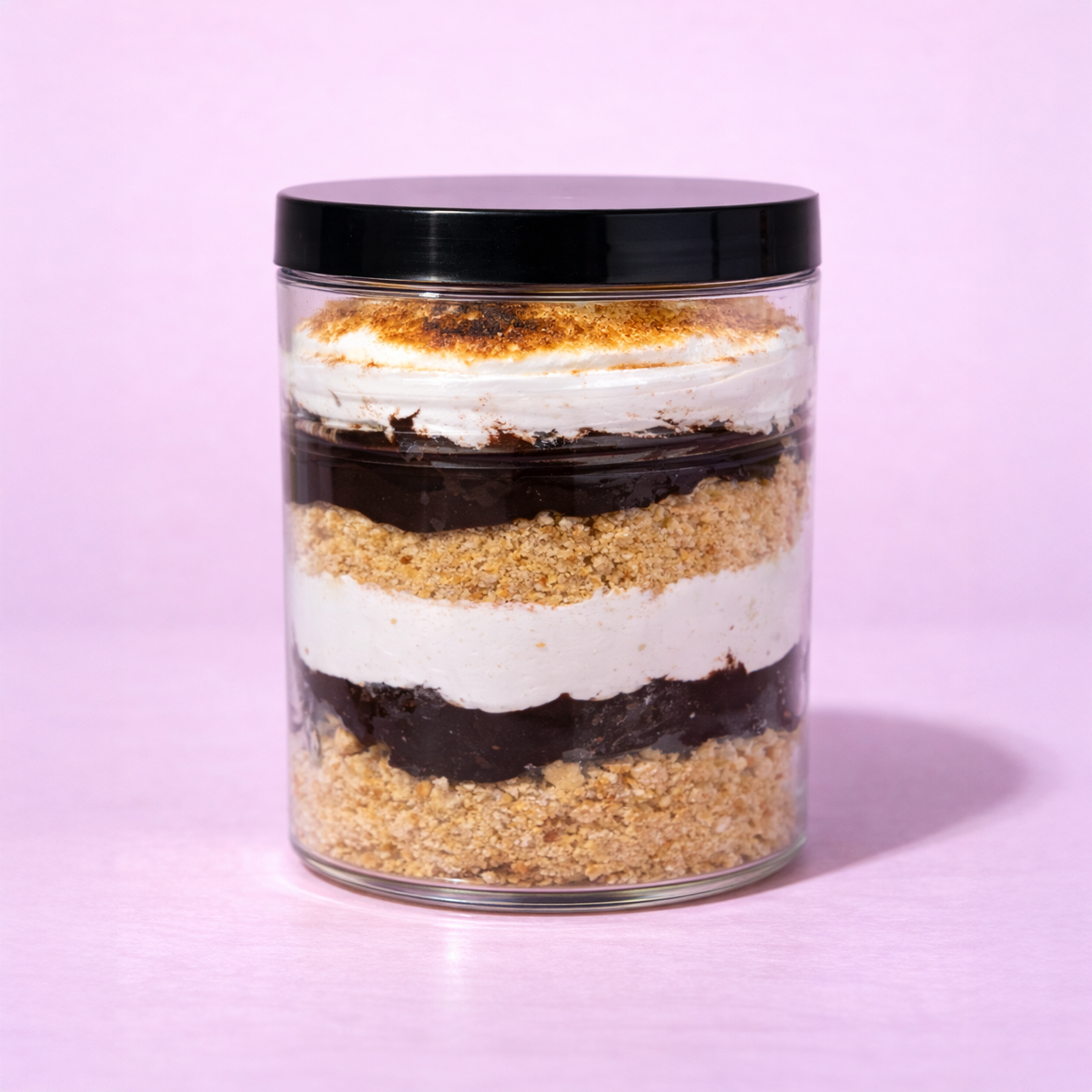 Our S’mores Cake Jar features rich chocolate cake layered with fluffy marshmallow frosting and smooth chocolate ganache, finished with buttery graham cracker crumble for that authentic fireside flavor.